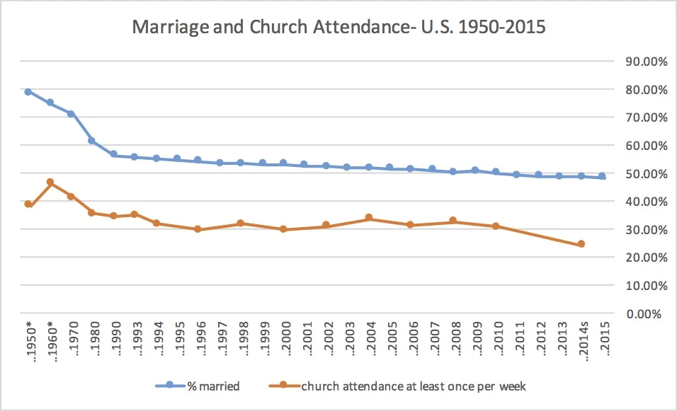 If we look at church attendance versus marital status from 1950-2015 (various sources), we find an interesting parallel. As the percentage of married people declines, so does church attendance. Self-reported once per week church attendance has steadily declined from 48% in 1960 to 24% in 2014.